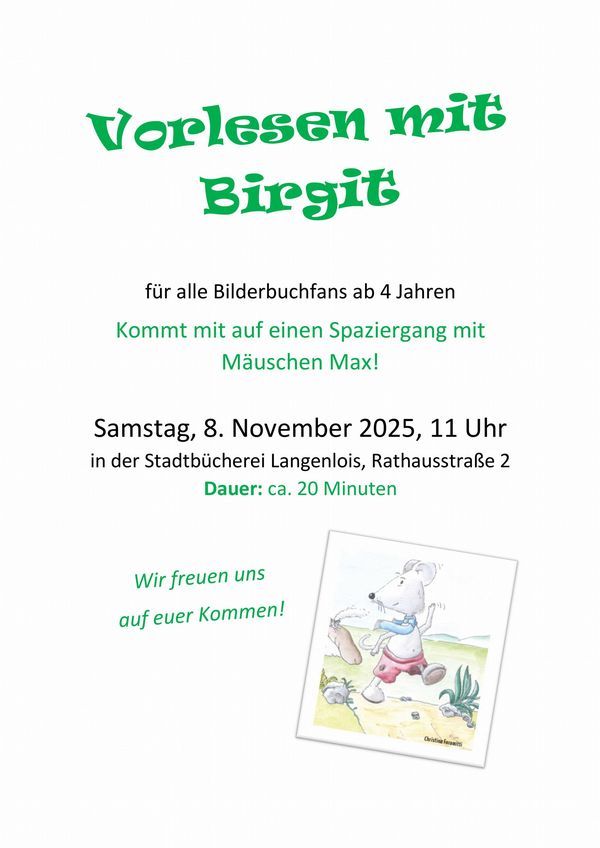 Wir starten wieder mit unseren Samstag-Vorlese-Stunden und starten am kommenden Samstag, 2. November 2024. Herzliche Einladung dazu!